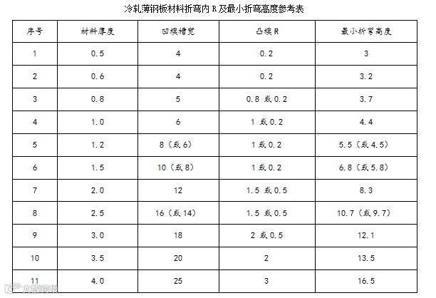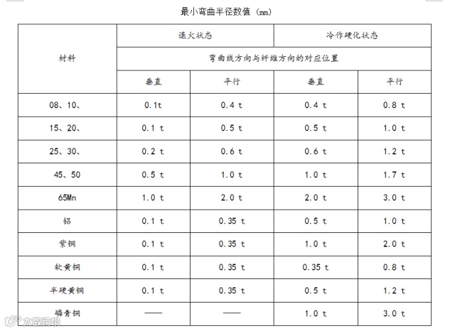 各种材料不同厚度的优选折弯半径(折弯内半径)见下表