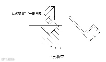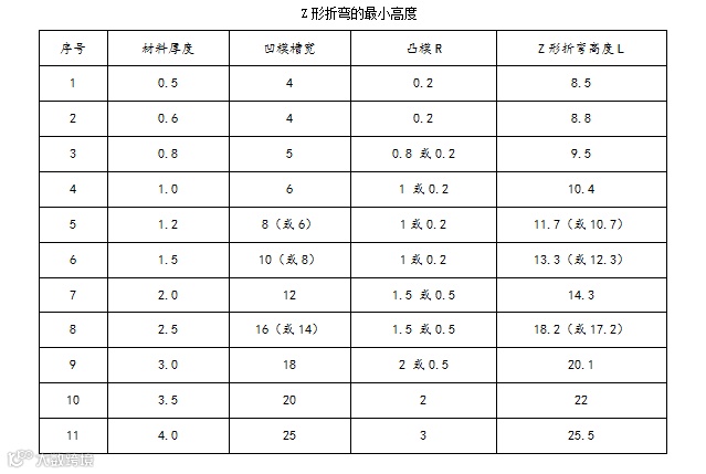 不同材料厚度的钣金Z形折弯对应的最小折弯尺寸L如下表所示: