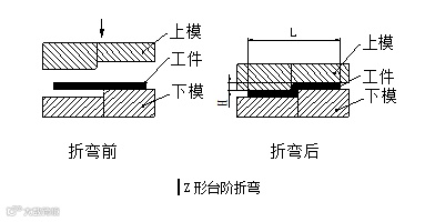 一些高度较低的钣金Z形台阶折弯,加工厂家往往采用简易模具在冲床或者油压机上加工,批量不大也可在折弯机上用段差模加工,如下图所示。但是,其高度H不能太高,一般应该在(0~1.0)t,如果高度为(1.0~4.0)t,要根据实际情况考虑使用加卸料结构的模具形式。