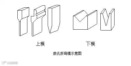 影响折弯加工的因素有许多,主要有上模圆弧半径、材质、料厚、下模强度、下模的模口尺寸等因素。为满足产品的需求,在保证折弯机使用安全的情况下,厂家已经把折弯刀模系列化了,我们在结构设计过程中需对现有折弯刀模有个大致的了解。见下图左边为上模,右边为下模。