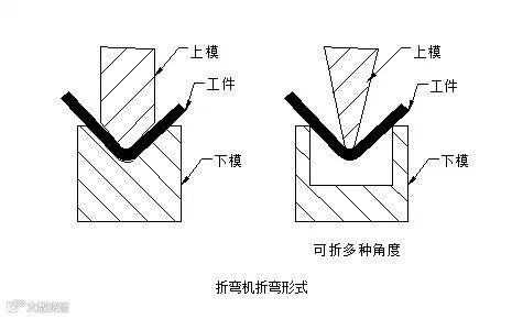 折弯机分普通折弯机和数控折弯机两种。由于精度要求较高,折弯形状不规则,通信设备的钣金折弯一般用数控折弯机折弯,其基本原理就是利用折弯机的折弯刀(上模)、V形槽(下模),对钣金件进行折弯和成形。