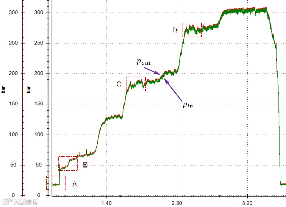 6、加载过程为50bar,停顿;150bar,停顿;200bar,停顿;250bar,停顿;300bar,结束加载,稳定2分钟后,