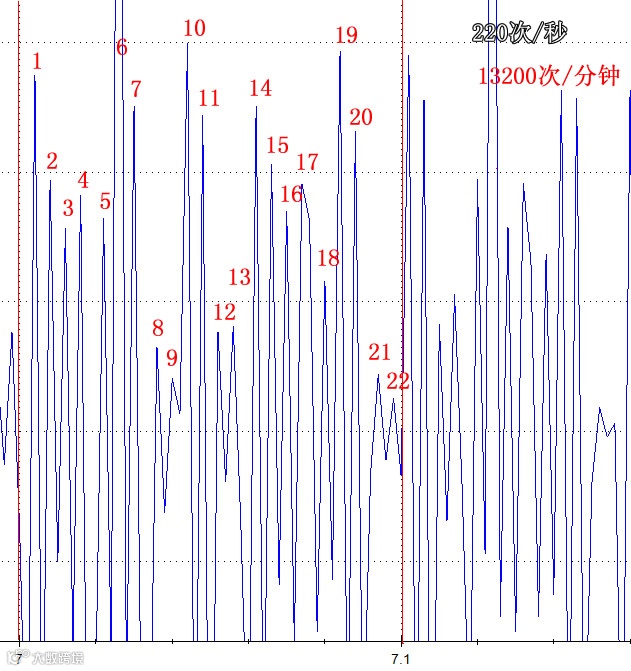 图中,每0.1秒,有22次脉动,即是220次波/秒,相当于13200次/分钟;