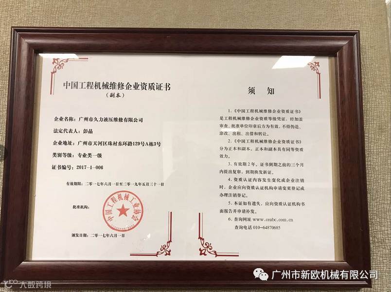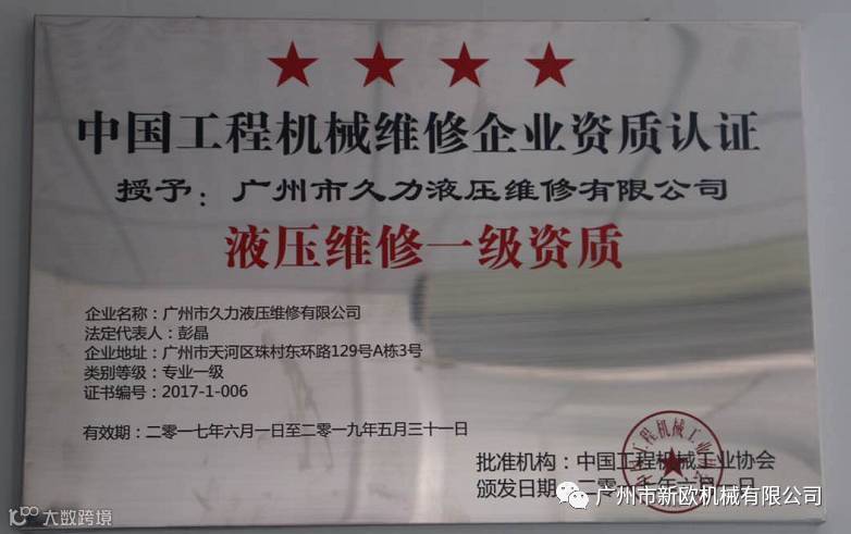 新液压服务伙伴—广州久力液压再制造中心获得中国工程机械维修企业一级资质认定!