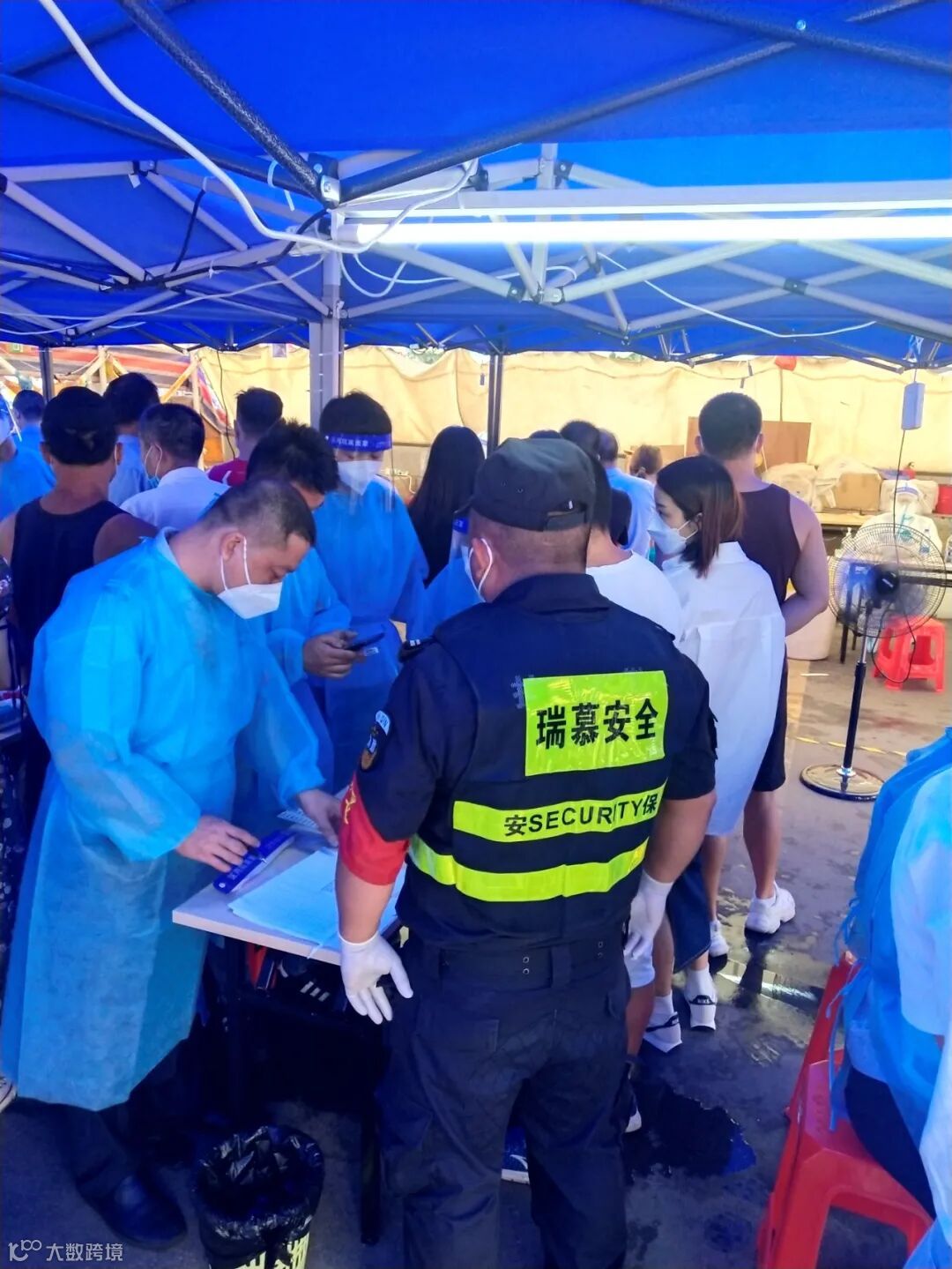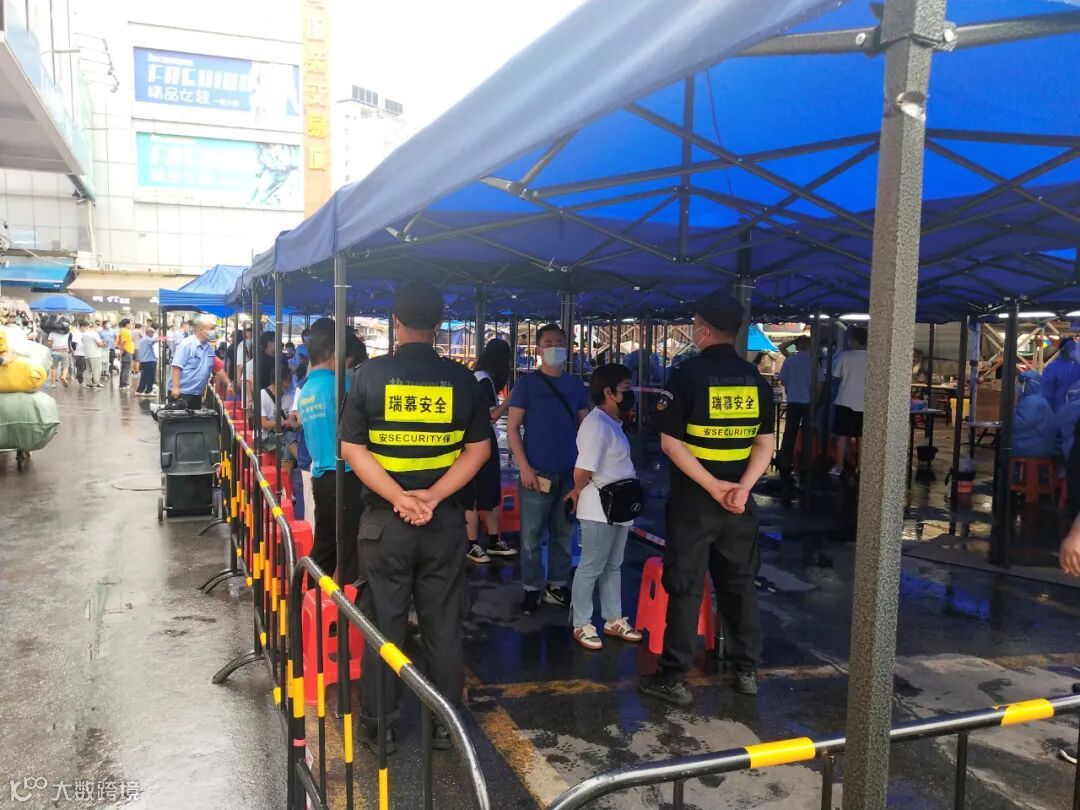 在核酸检测前期筹备工作中,广东瑞慕保安员不惧天气炎热,不畏暴雨突袭;在核酸检测工作进行中,广东瑞慕保安员张弛有度地完成现场秩序维护工作,并且帮助检测点的医护人员搭建帐篷,引导核酸检测人员提前扫码,对人流进行有效管控,有效避免了挤压踩踏事件的发生,尽可能保障市场内商户的安全。
