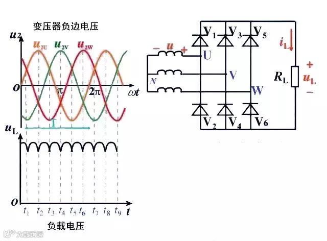 在一个周期中,每个二极管只有三分这一的时候导通(导通角为120度)。负载两端的电压为线电压。