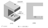 对于图 2-1 所示的形状,即使尝试用刀具进行加工,前面的形状也会形成干扰,无法切削凹切部分。这样,如果有从一个方向看处于阴影中的部分,就需要对机加工下一些功夫。还会经常出现无法加工的情况。
