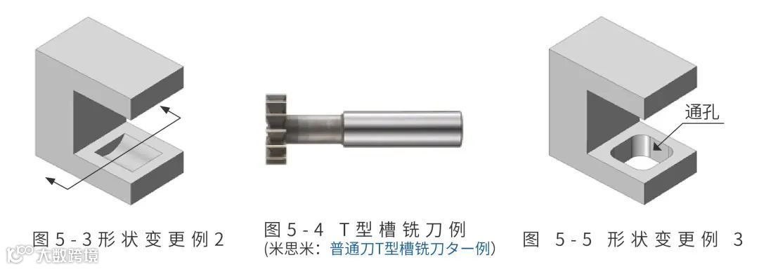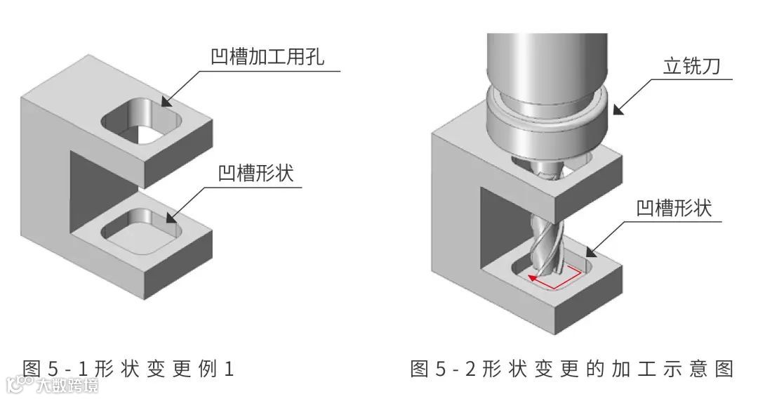 在考虑更改形状时,设计人员首先要考虑的是这种难以加工的凹切形状究竟是否有必要。最简单的解决方案是如图 5-5 所示使凹槽形状贯穿。当然图 5-5是一种只需要进行机加工就可以很容易制造的形状,所以请考虑这样的形状是否不可以。