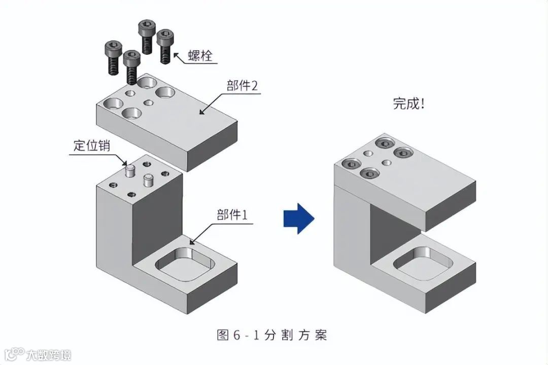 一个典型的例子是如图6-1 所示的分割。这是一种预先在部件1上开设螺纹孔,然后用螺栓将部件1与部件2连结起来的方法。在两个部件上预先开设定位孔并插入定位销,由此也能够高精度地组装。