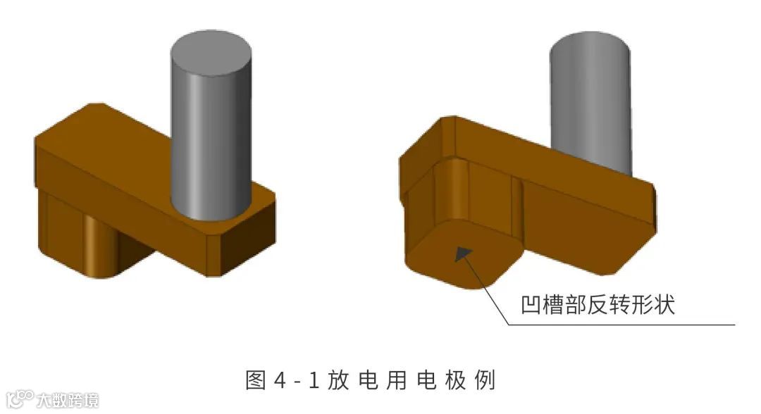 此时,在电极与工件之间发生电弧放电,能够使电极形状中形成凹陷。只要有“使用电极熔融工件”的印象即可。此时制作的电极例如是图4-1那样的形状。电极主要通过机加工制作。