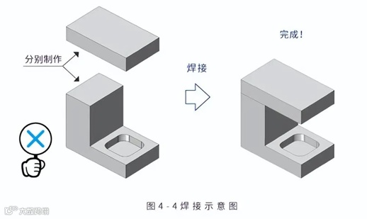 接下来,是制作单独的构件并将它们焊接在一起的方法。通过焊接形成的一体式结构除了实现这种凹切形状外,还是常用于设备零件等的制造方法。需要注意的是要设想到材料是否适合焊接、焊接变形怎么办、焊接本身的规格(所谓打点、填充、堆焊等)、焊后处理等,并将其反应到图纸中。