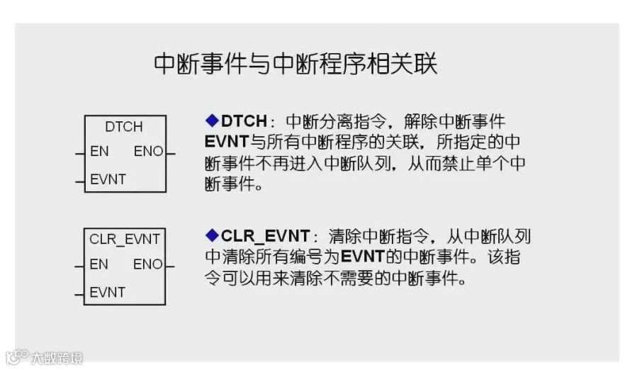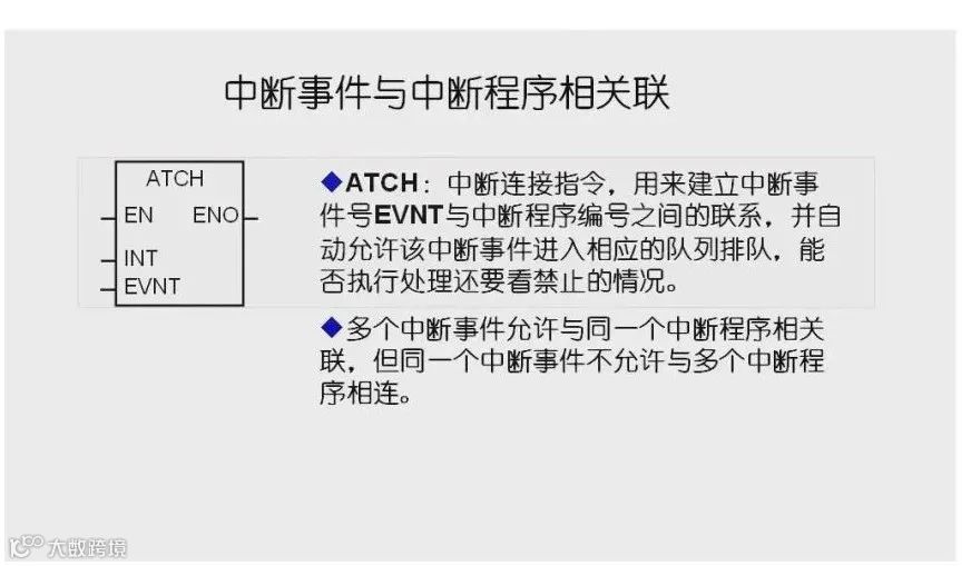 中断连接指令,用来建立中断事件号EVNT与中断程序编号之间的联系,并自动允许该中断事件进入相应的队列排队,能否执行处理还要看禁止的情况。多个中断事件允许与同一个中断程序相关联,但同一个中断事件不允许与多个中断程序相连。