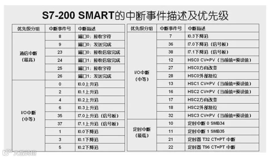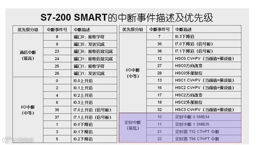 中断就是中止当前正在运行的程序,去执行为立刻响应的信号而编写的中断服务程序,执行完毕后再返回原来中止的程序并继续执行。西门子S7-200 SMART CPU最多支持38个中断事件,其中8个为预留。为了便于识别,系统给每一个中断事件都分配了一个编号,又称中断事件号。