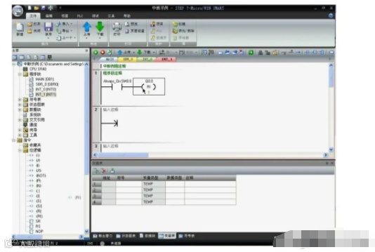 接下来我们通过一个简单的例子来学习中断指令的使用,并练习编写中断程序。在I0.0的上升沿通过中断使Q0.0立即置位,在I0.1的下降沿通过中断使Q0.0立即复位。我们来编写程序,启动STEP7-Micro/WIN SMART创建一个新项目,创建新项目后首先编写处理I0.0上升沿事件的中断程序,在指令树的位逻辑中拖放一个常开触点到中断程序INT_0,输入地址SM0.0,再拖放一个立即置位指令,输入地址Q0.0,置位个数为1。