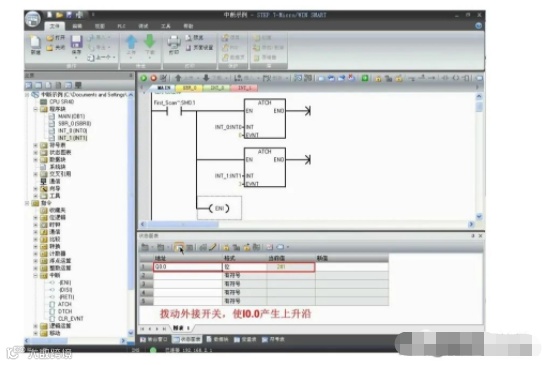 回到主程序,拖放一个常开触点输入地址SM0.1,在指令树的中断文件夹中拖放中断连接指令到编程区域,INT处输入0号中断程序名,EVNT处输入I0.0上升沿事件号0,向下分支,再拖放一个中断连接指令,INT处输入1号中断程序名,EVNT处输入I0.1下降沿事件3,继续向下分支,拖放一个中断允许指令,这样在程序第一次扫描时就关联了中断事件以及相应的中断服务程序并允许全局中断,程序编写完成后保存项目。