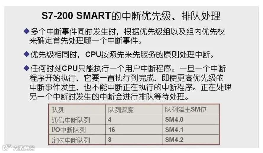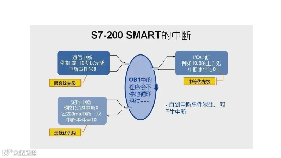西门子S7-200 SMART规定的中断优先级由高到低依次是通信中断、I/O中断、定时中断。S7-200 SMART的中断管理是通过指令完成的,中断指令包括中断允许与中断禁止指令、中断连接与中断分离指令。CPU进入RUN模式时,自动禁止所有中断。