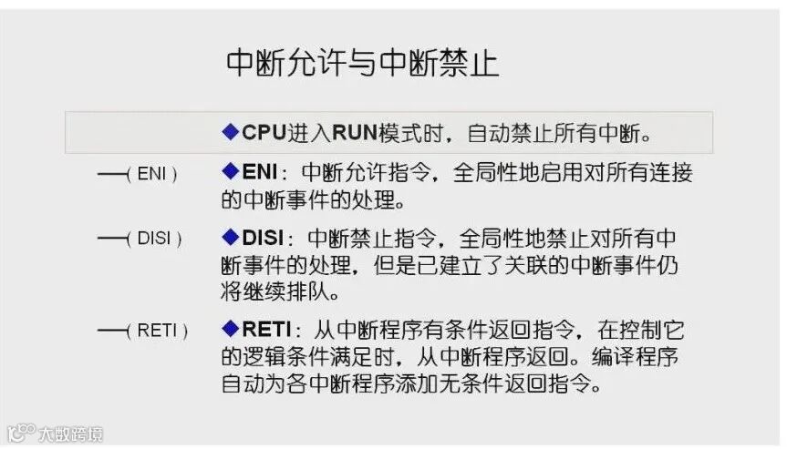 中断允许指令,全局性地启用对所有连接的中断事件的处理。中断禁止指令,全局性地禁止对所有中断事件的处理,但是已建立了关联的中断事件仍将继续排队。从中断程序有条件返回指令,在控制它的逻辑条件满足时,从中断程序返回。编译程序自动为各中断程序添加无条件返回指令。