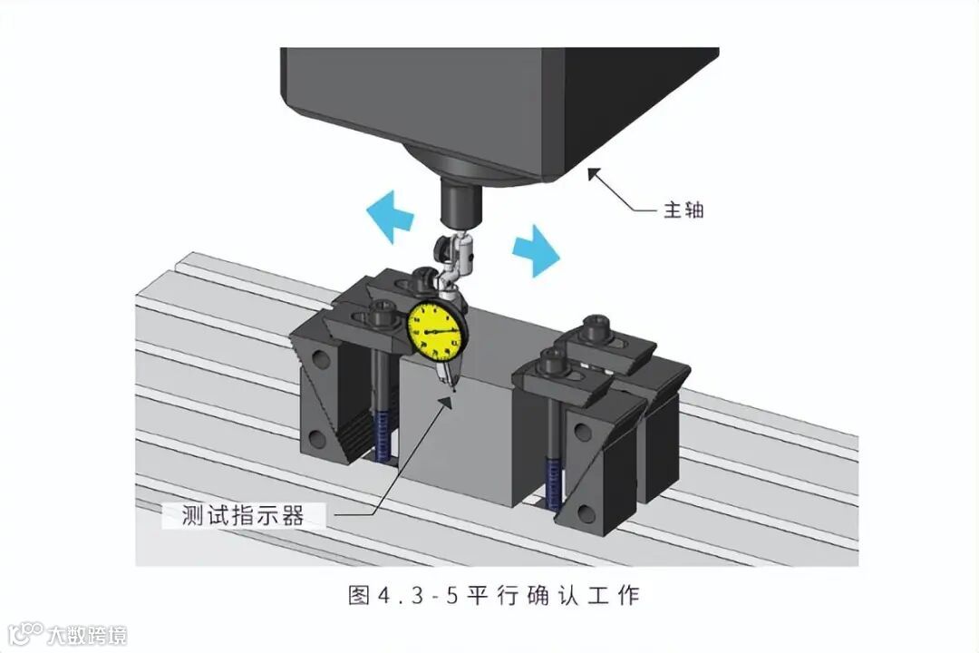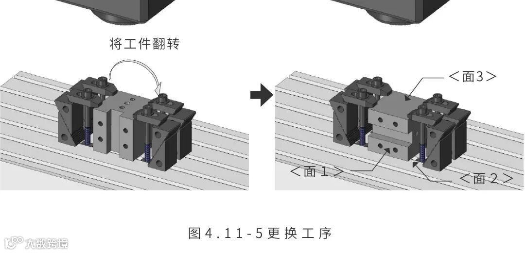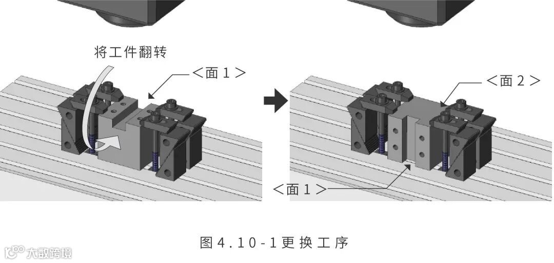 当然,由于是将工件翻转,重新装夹,因此在工作台上的位置和朝向也都发生改变。因此要进行“工件找平行”—“固定工件”—“设置原点”这些工序准备工作。该更换工序工作是最费功夫的部分。