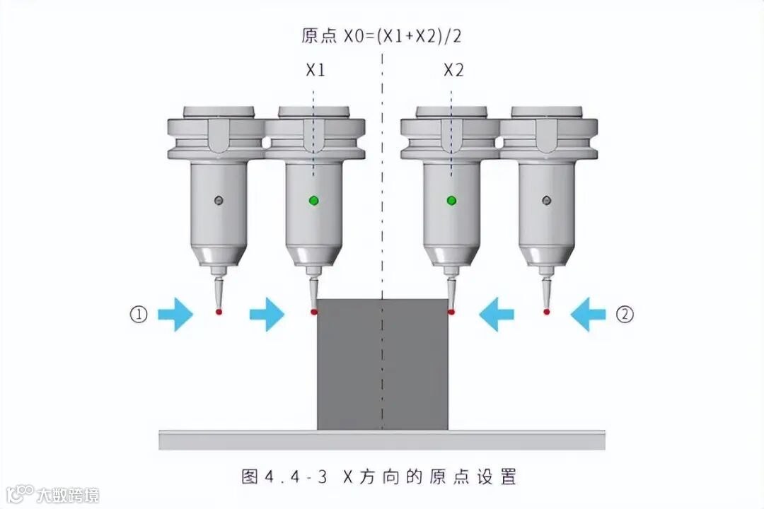接下来,像②那样,将Point Master从右侧移近工件,并记录右侧表面的位置 (X2)。然后将 X1 和 X2 的中点作为该工件 的X 轴的原点 X0 输入机器。同样对于前后方向的Y轴,记录近前侧(Y1)和里侧(Y2)的位置,将其中点作为Y轴的原点Y0输入机器。