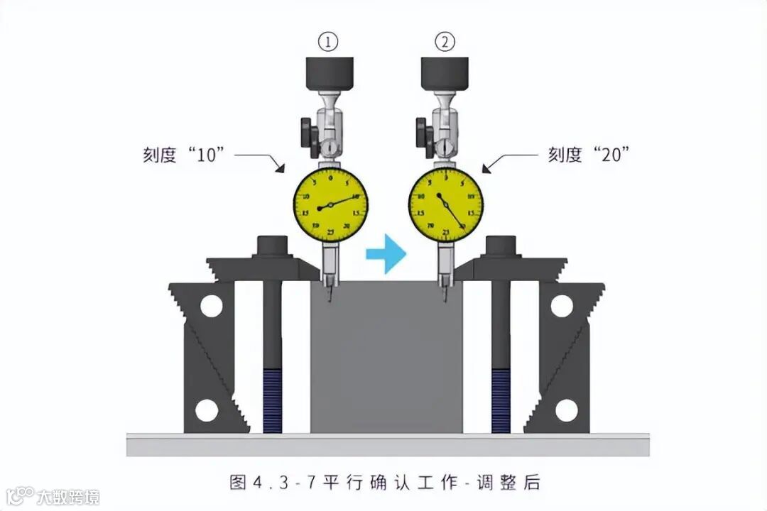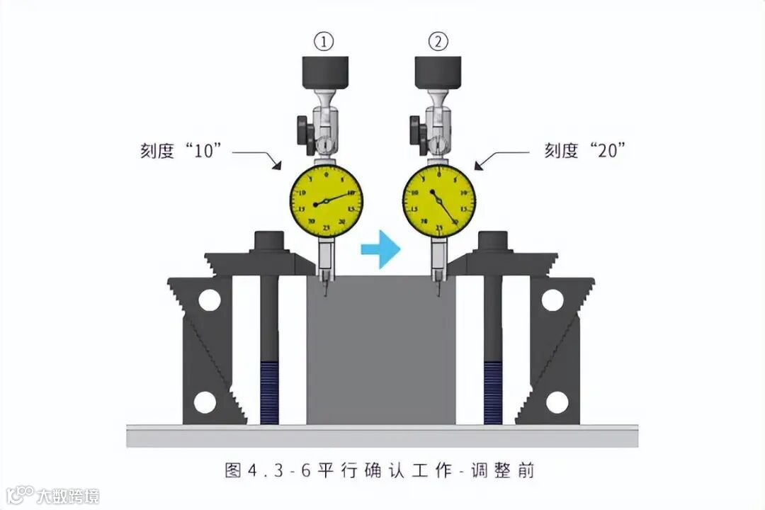 例如,假设如图4.3-6所示,在工件的左侧将测试指示器按压至数值“10”(①的状态),然后保存状态不变移动到右侧(X方向)(②的状态)。在右侧,表盘更改为“20”。如果表盘是1刻度0.01毫米,则20-10=10个刻度,所以有0.1毫米左右的倾角。(严格来说,需要校正探头倾斜的量)