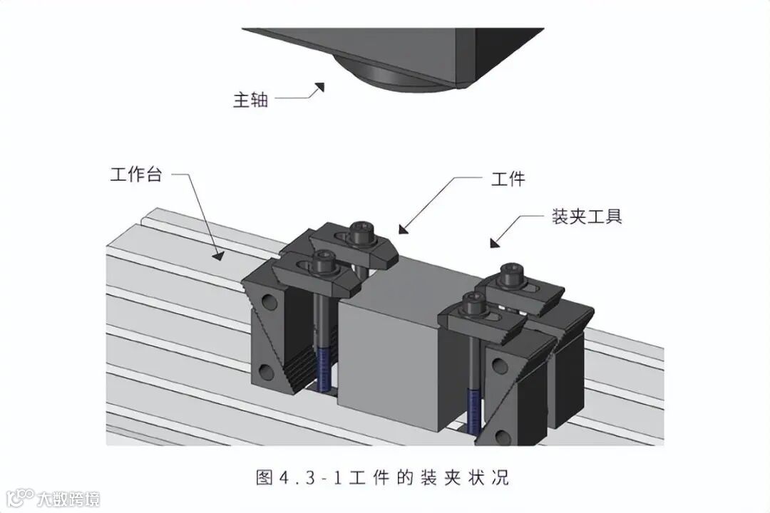 装夹工具是利用工作台的凹槽用爪等工具将工件与工作台面夹紧来固定工件的工具。将机器的工作台面和工件底面擦拭干净,防止切屑被夹住,然后将工件放在工作台面上。如图 4.3-1 所示,用夹具固定工件。