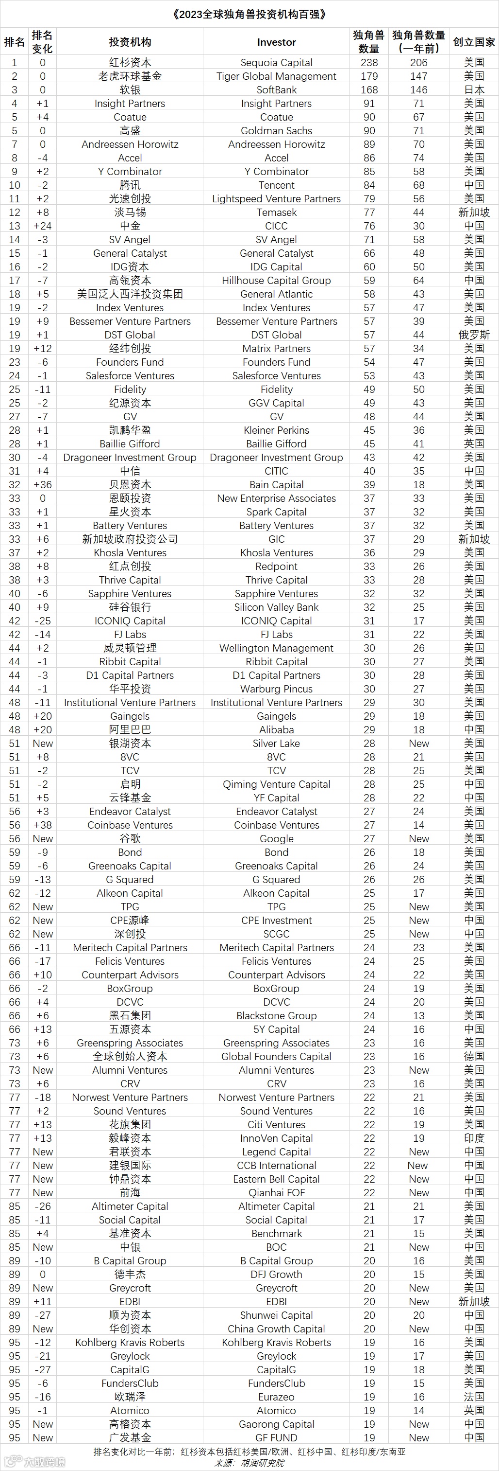 《2023全球独角兽投资机构百强》的完整名单,请参见附录1。