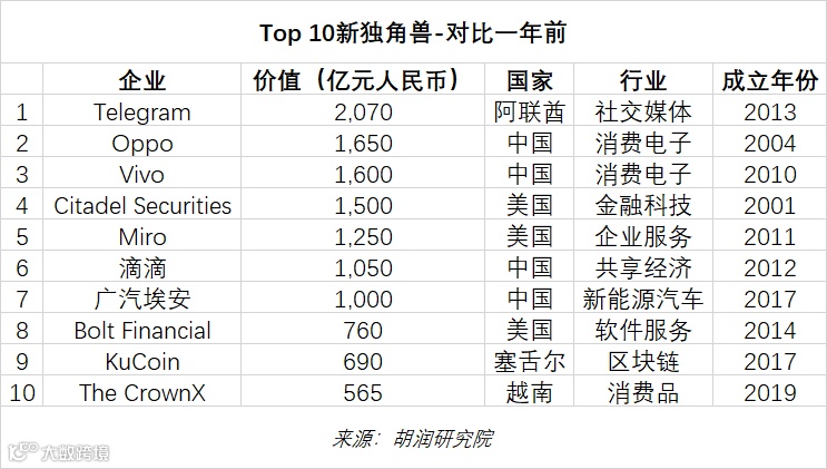 中国智能手机制造商Oppo和Vivo,以及由投资人肯·格里芬创立的总部迈阿密的Citadel Securities已经是大公司,今年才被纳入全球独角兽榜。滴滴退市后再次成为独角兽。总部塞舌尔的加密货币交易所KuCoin逆势而行,去年7月融资1.5亿美元,估值100亿美元。