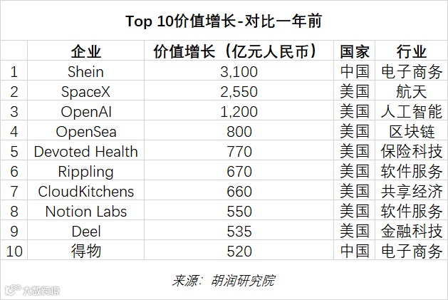 过去一年全球表现最好的独角兽是Shein、SpaceX和OpenAI,分别增加了3100亿元、2600亿元和1200亿元人民币。过去一年增加了100亿美元以上的其他独角兽包括OpenSea和Devoted Health。