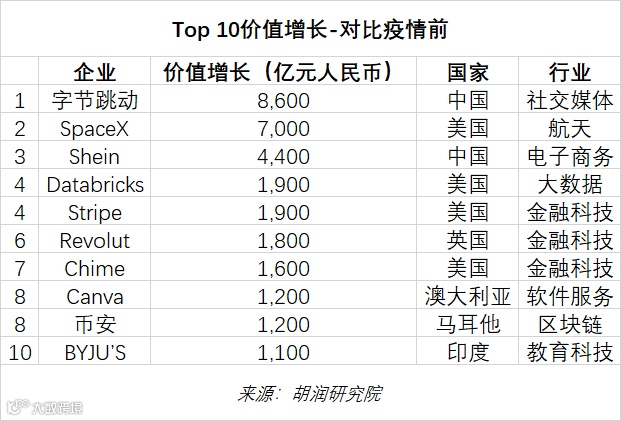 自疫情前以来,表现最好的独角兽是字节跳动,增长8600亿元,SpaceX增长7000亿元,Shein增长亿元。其他包括Databricks、Stripe、Revolut和Chime。