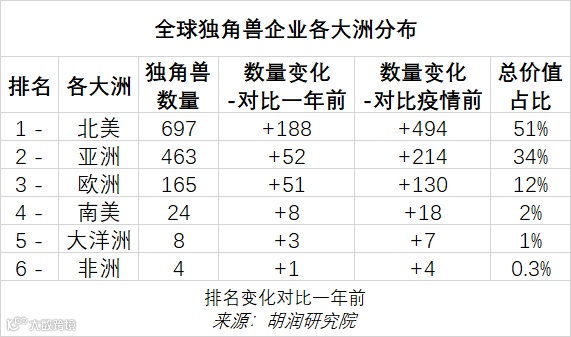 从各大洲来看,北美拥有最多的独角兽企业,有697家,其次是亚洲,有463家。就总价值而言,北美独角兽以14万亿元人民币的总价值领先,其次是亚洲,12万亿元,再次是欧洲,3万亿元。