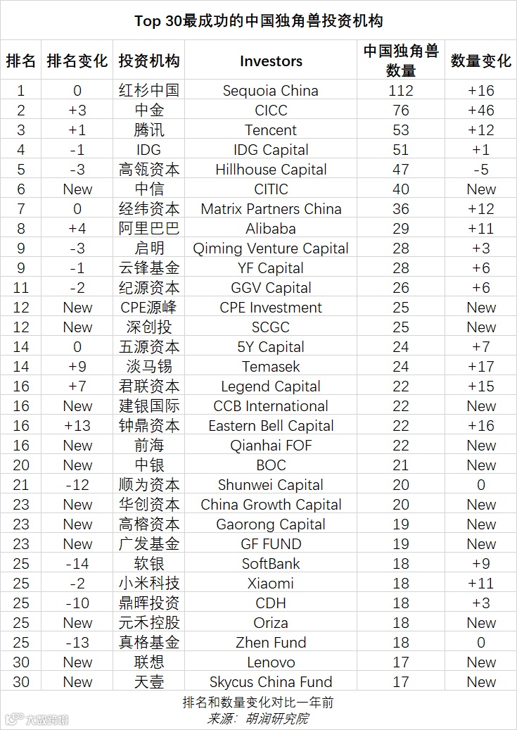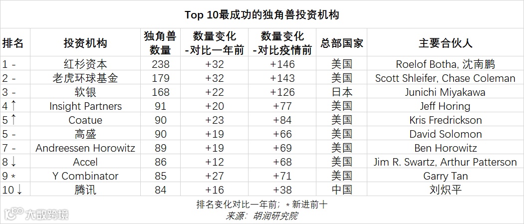 红杉资本仍是全球最成功的独角兽投资机构,共投资了238家独角兽企业,其次是老虎环球基金和软银。