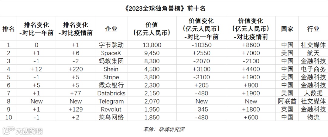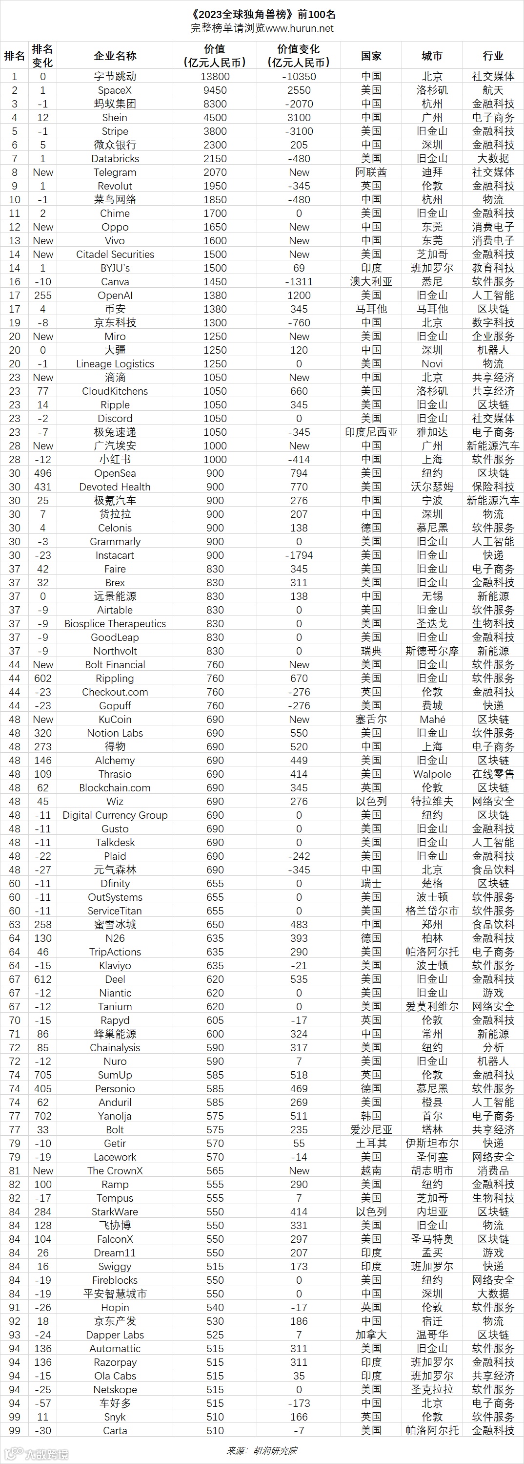 日前,胡润研究院发布《2023全球独角兽榜》(Global Unicorn Index 2023),列出了全球成立于2000年之后,价值10亿美元以上的非上市公司。本次榜单估值计算的截止日期为2022年12月31日,在发布之前更新了估值的重大变化。