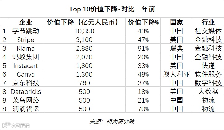 过去一年,价值下降最多的是字节跳动,在全球科技泡沫破裂的背景下,字节跳动价值下降了1万多亿,其次是总部旧金山的支付平台Stripe和斯德哥尔摩的金融科技公司Klarna,分别下降3100亿元和2900亿元。