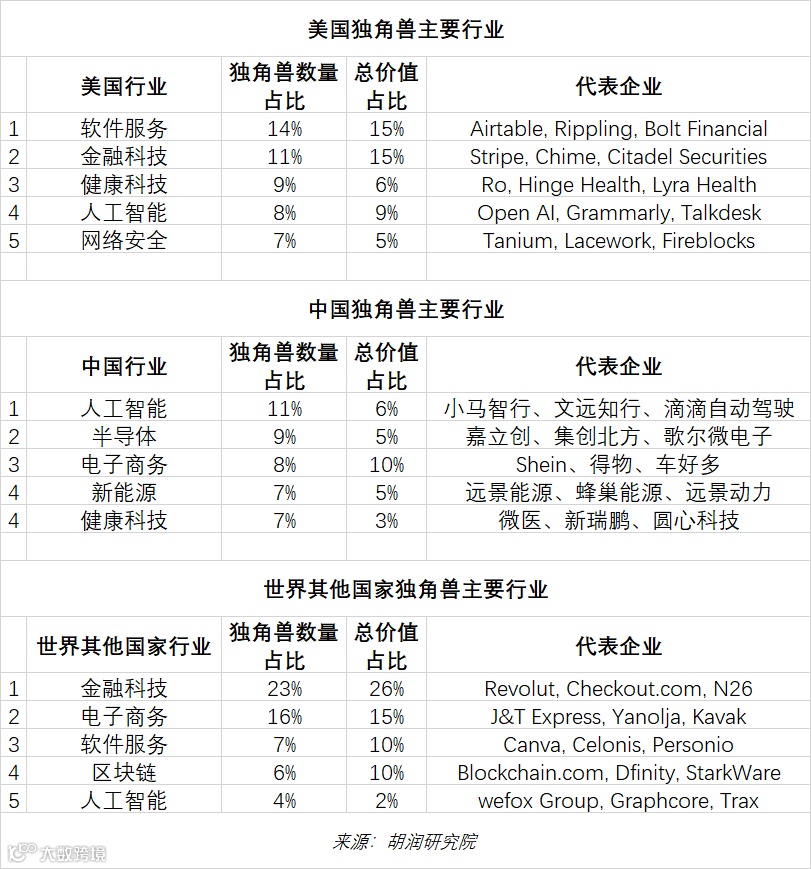 美国独角兽企业的主要行业是软件服务、金融科技和健康科技,中国是人工智能、半导体和电子商务,而世界其他国家是金融科技和电子商务。