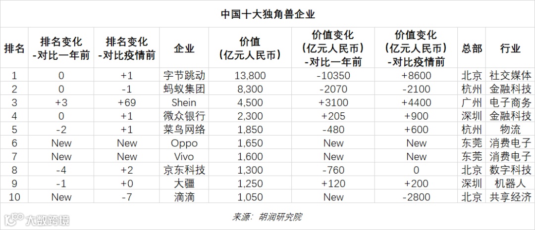 前十名中,5家来自中国,3家来自美国,各1家来自英国和阿联酋。前10名门槛270亿美元,比一年前下降了60亿美元。前十名占全球独角兽企业总价值的17%。
