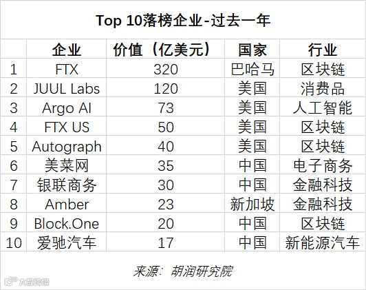 过去一年,133家前独角兽企业价值跌至10亿美元以下而“降级”退出榜单,其中55家来自中国,50家来自美国。最大的落榜者是总部巴哈马的加密货币交易所FTX,去年估值320亿美元,在去年11月宣布破产,从它剥离出的FTX US,去年价值50亿美元,也已落榜。其他落榜的公司包括美国电子烟品牌JUUL Labs(去年120亿美元),随着人们越来越担心该品牌对青少年的营销带来的伤害。自动驾驶公司Argo AI去年价值73亿美元,但在大股东福特和大众撤资后关闭。由NFL球星汤姆·布雷迪共同创立的体育NFT平台Autograph落榜,去年价值40亿美元,今年不到10亿美元。