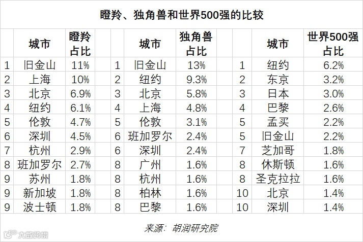 从城市来看,旧金山、上海、北京、深圳和班加罗尔有更多的瞪羚和独角兽企业,五年内应该会有更多的世界500强企业。东京和巴黎的创业企业司较少,它们在胡润世界500强中的比例可能会下降。伦敦似乎很稳定。