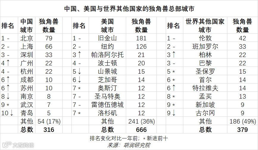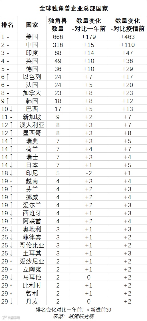 美国以666家独角兽企业领先,比一年前增加179家;中国以316家位居第二,比一年前增加15家。