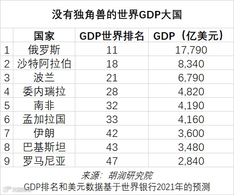 俄罗斯、沙特阿拉伯、波兰、委内瑞拉和南非这几个世界GDP大国没有一家独角兽。世界上近150个国家没有独角兽。
