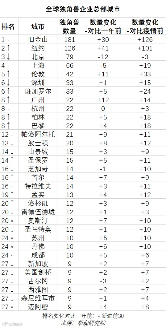 进入“胡润全球30大创业城市”至少需要9家独角兽企业。对比一年前,苏州、成都、奥斯汀、丹佛和迈阿密新进前30,挤掉了香港、南京、亚特兰大和圣何塞。