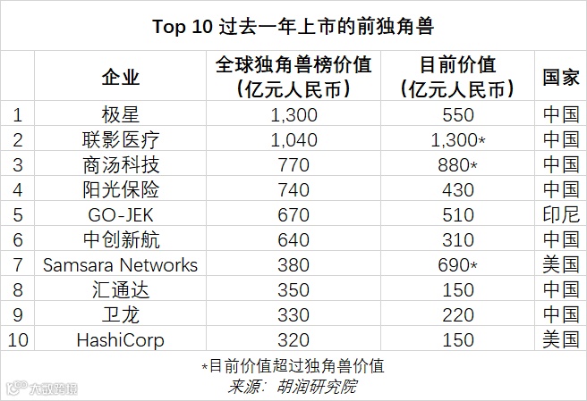 过去一年上市的前独角兽中,表现较好的包括美国工业物联网公司Samsara Networks、中国医疗设备公司联影医疗和人工智能公司商汤科技,这三家公司目前价值都比之前在全球独角兽榜上更高。美国短租公司Vacasa目前价值不到10亿美元,主要因为业绩不如预期。