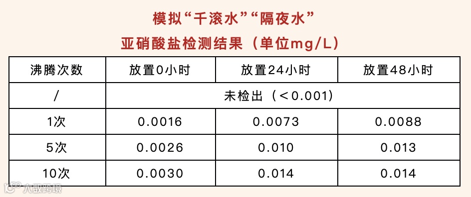 实验发现,随着加热沸腾次数的增加,水中亚硝酸盐含量有略微增加的趋势,放置48小时后亚硝酸盐含量最高为0.014mg/L,但距离我国国家标准生活饮用水中1mg/L亚硝酸盐参考指标限值还很远,所以从这点上来看,所谓的“千滚水”、“隔夜水”是可以放心喝的。