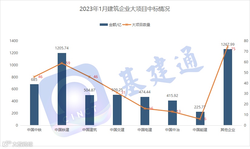 2023年1月各建筑企业基建大项目中标金额前五分别是:中国铁建、中国中铁、中国交建、中国建筑、中国电建。中国铁建1月拿下 59 个大项目/标段,中国铁建昆仑投资集团联合铁五院、中铁建设集团、中铁二十二局、中铁十一局、中铁十二局、中铁十六局、中铁二十一局等中标《郑州南站枢纽产业园区项目》,该项目总投资303.27亿元!