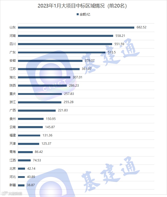 从1月大项目所处省份来看:山东省约 47 个重大项目公布中标人,金额达682亿,为第一;其次是河南、山东、四川等地。