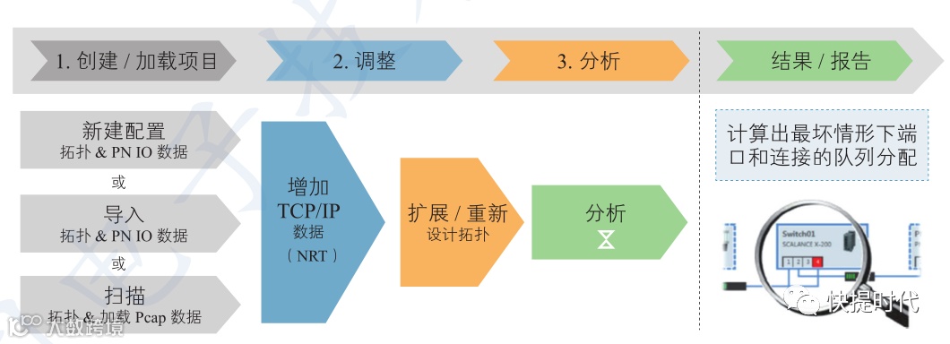 对PFOFINET工业网络的规划、仿真与测试,通过三步即可达到目的,包括创建/加载项目、调整、分析并输出报告。