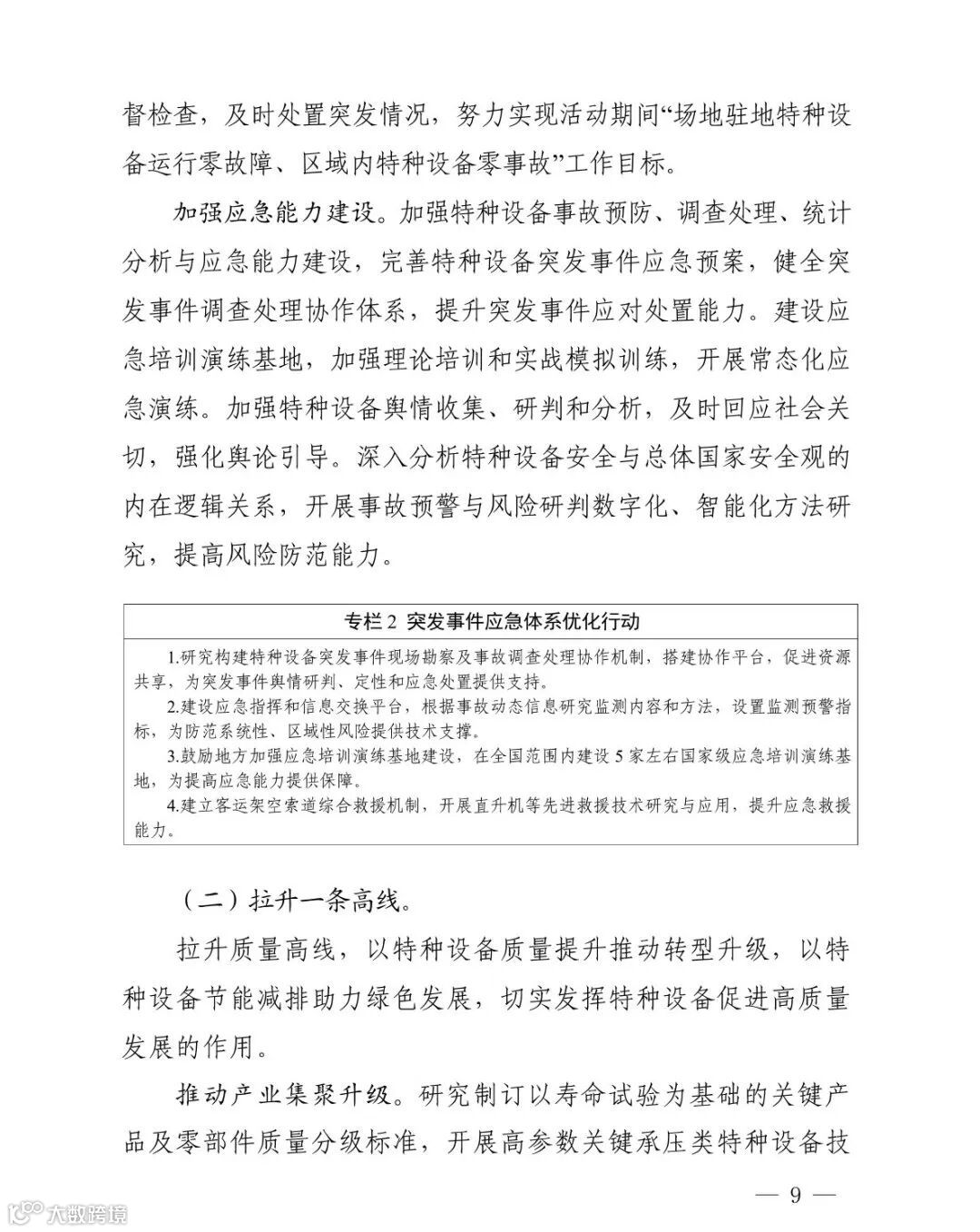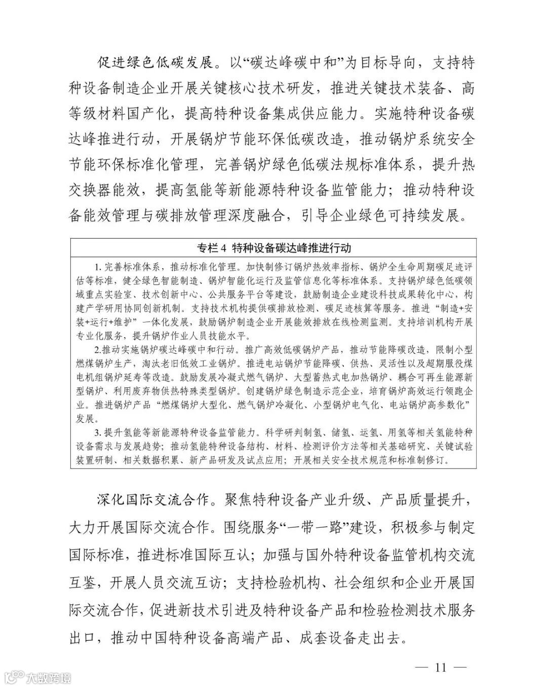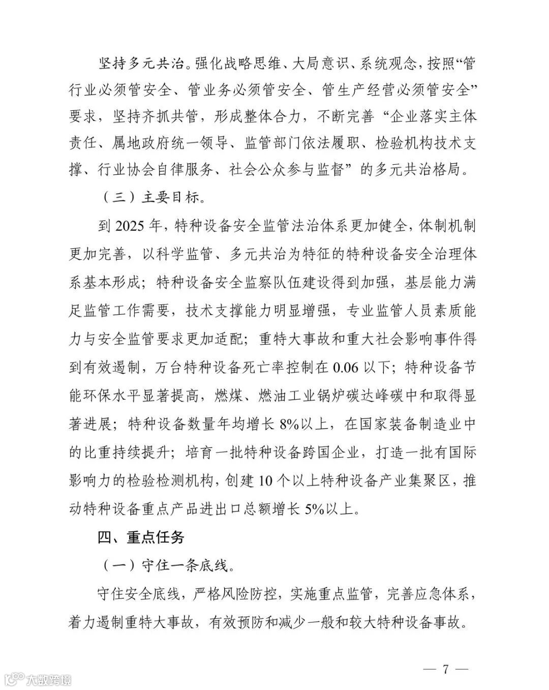 《规划》主要目标提出,培育一批特种设备跨国企业,打造一批有国际影响力的检验检测机构,创建10个以上特种设备产业集聚区,推动特种设备重点产品进出口总额增长5%以上。