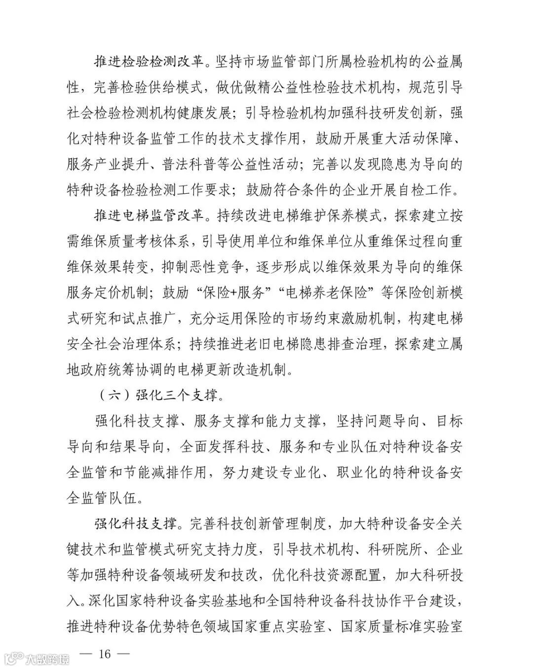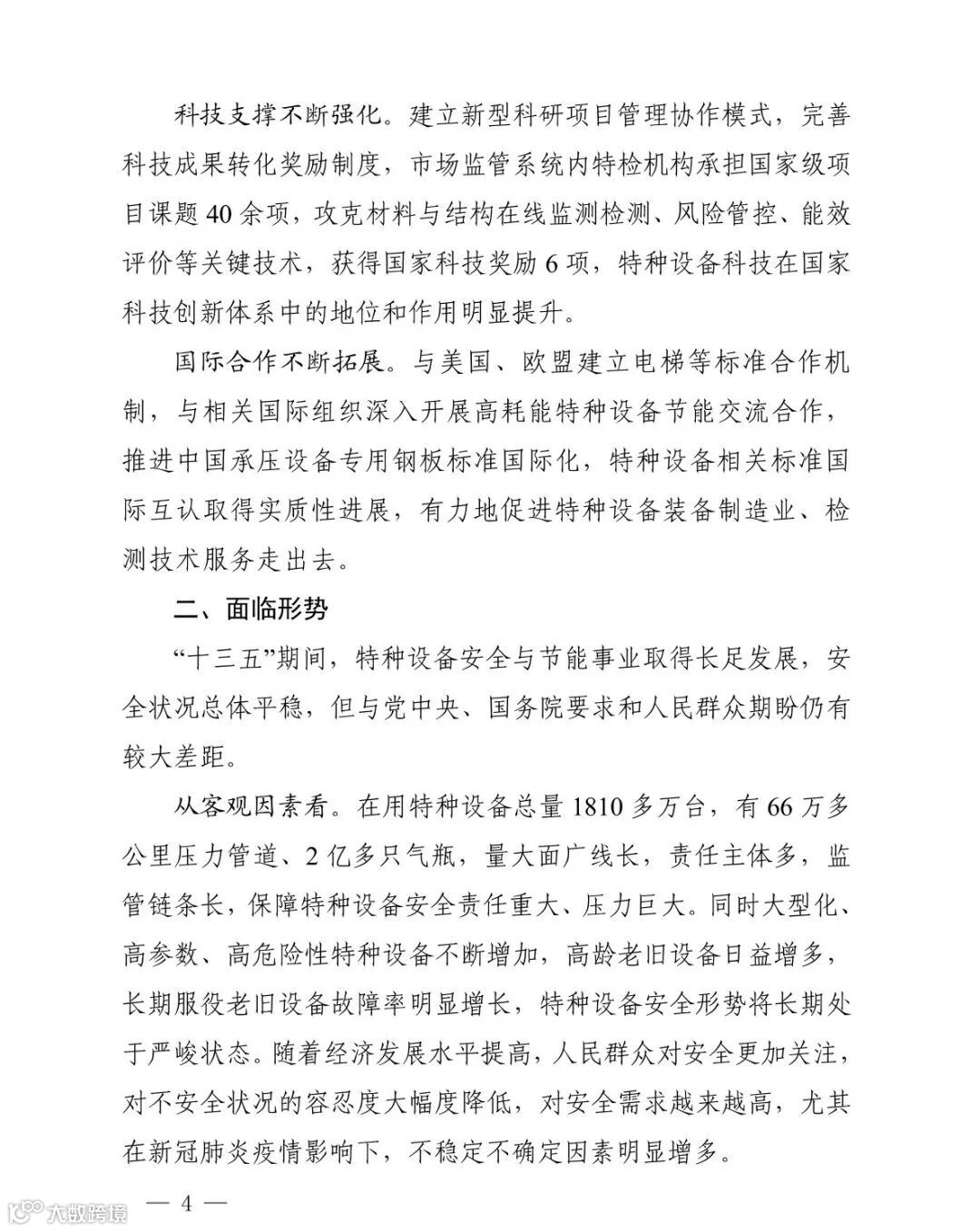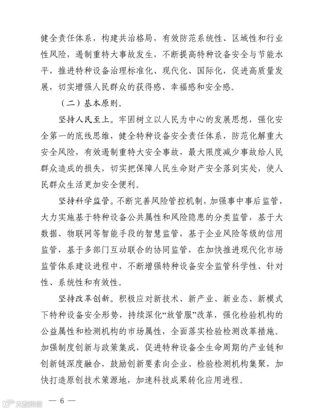 《规划》的基本原则提出,积极应对新技术、新产业、新业态、新模式下特种设备安全形势,持续深化“放管服”改革,强化检验机构的公益属性和检测机构的市场属性,全面落实检验检测改革措施。加强制度创新与政策集成,促进特种设备全生命周期的产业链和创新链深度融合,鼓励创新要素向企业、检验检测机构集聚,加快打造原创技术策源基地,加速科技成果转化应用进程。