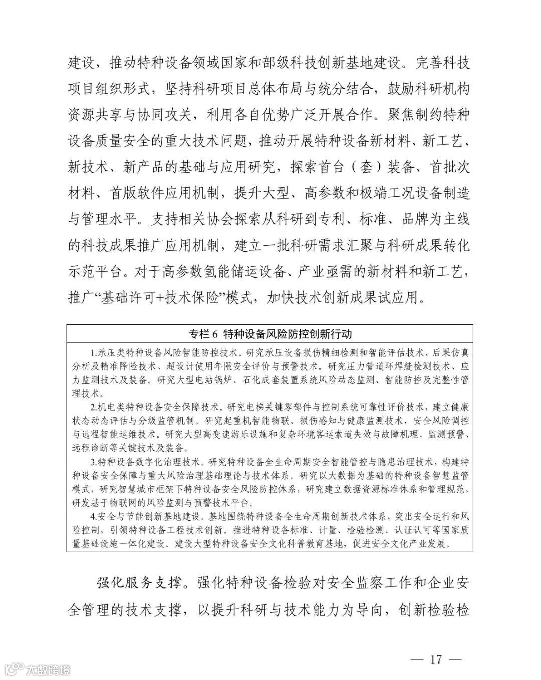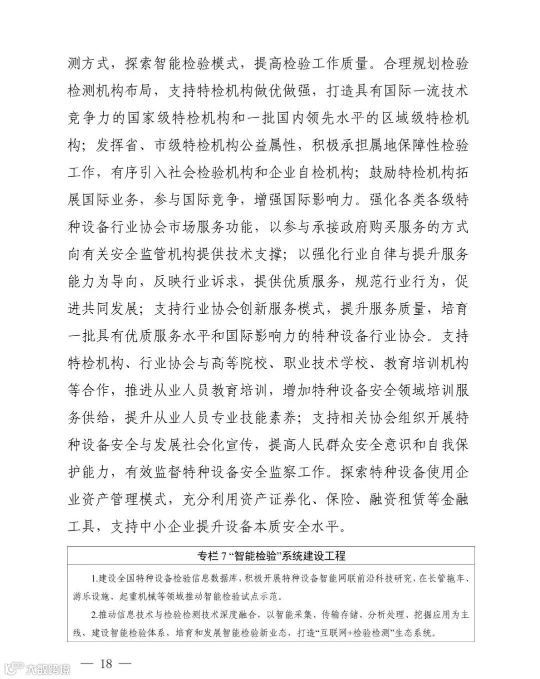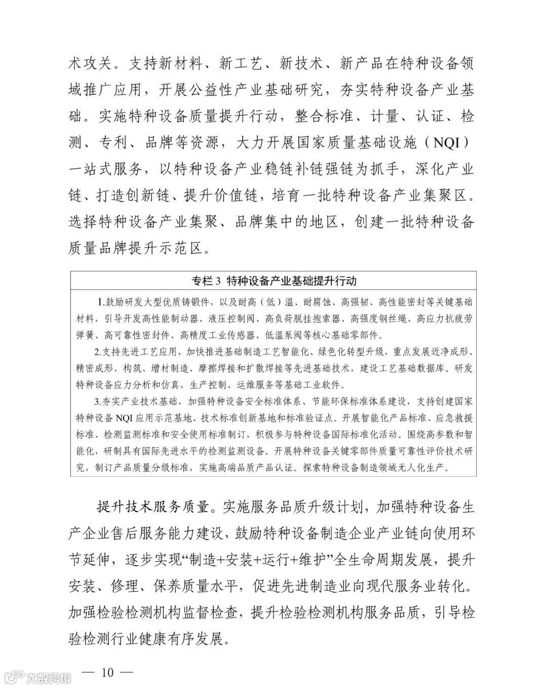 强化特种设备检验对安全检查工作和企业安全管理的技术支撑,以提升科研与技术能力为导向,创新检验检测方式,探索智能检验模式,提高检验工作质量。合理规划检验检测机构布局,支持特检机构做优做强,打造具有国际一流技术竞争力的国家级特检机构和一批国内领先水平的区域级特检机构;发挥省,市级特检机构公益属性,积极承担属地保障性检验工作,有序引入社会检验机构和企业自检机构;鼓励特检机构拓展国际业务,参与国际竞争,增强国际影响力。特种设备产业基础提升行动专栏明确,开展特种设备关键零部件质量可靠性评价技术研究,制订产品质量分级标准,实施高端品质产品认证。