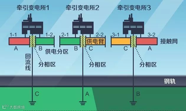为了让您看清楚,特地用颜色进行区分了哦~,如图中牵引变电所1和2之间的供电分区都是B相电、牵引变电所2和3之间都是C相电等。