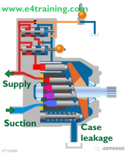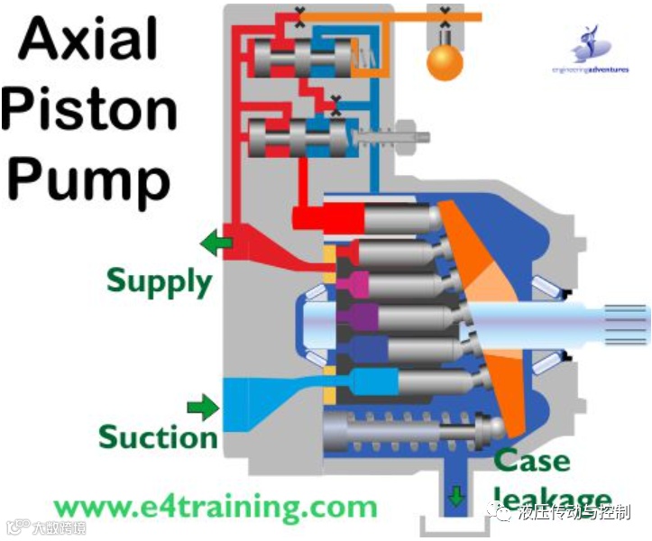 轴向柱塞泵通常有 9 个围绕中心驱动轴旋转的活塞。当活塞旋转时,它们会逆着斜盘或斜轴轴移动,这迫使它们沿着泵轴上下移动。当活塞缩回时,它们允许流体在油箱压头下填充不断增加的容积。当活塞通过上止点时,吸入口关闭,压力口打开,因此伸出的缸体可以将流体推出。